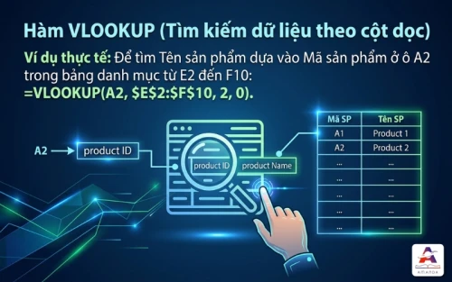- Ví dụ thực tế: Để tìm Tên sản phẩm dựa vào Mã sản phẩm ở ô A2 trong bảng danh mục từ E2 đến F10: =VLOOKUP(A2, $E$2:$F$10, 2, 0).