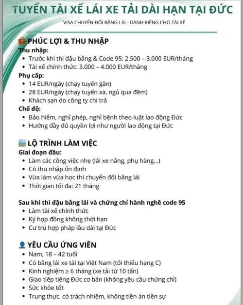 | Bằng cấp | Có bằng lái xe hạng C tại Việt Nam; khi sang Đức sẽ chuyển đổi sang bằng EU (Code 95) |